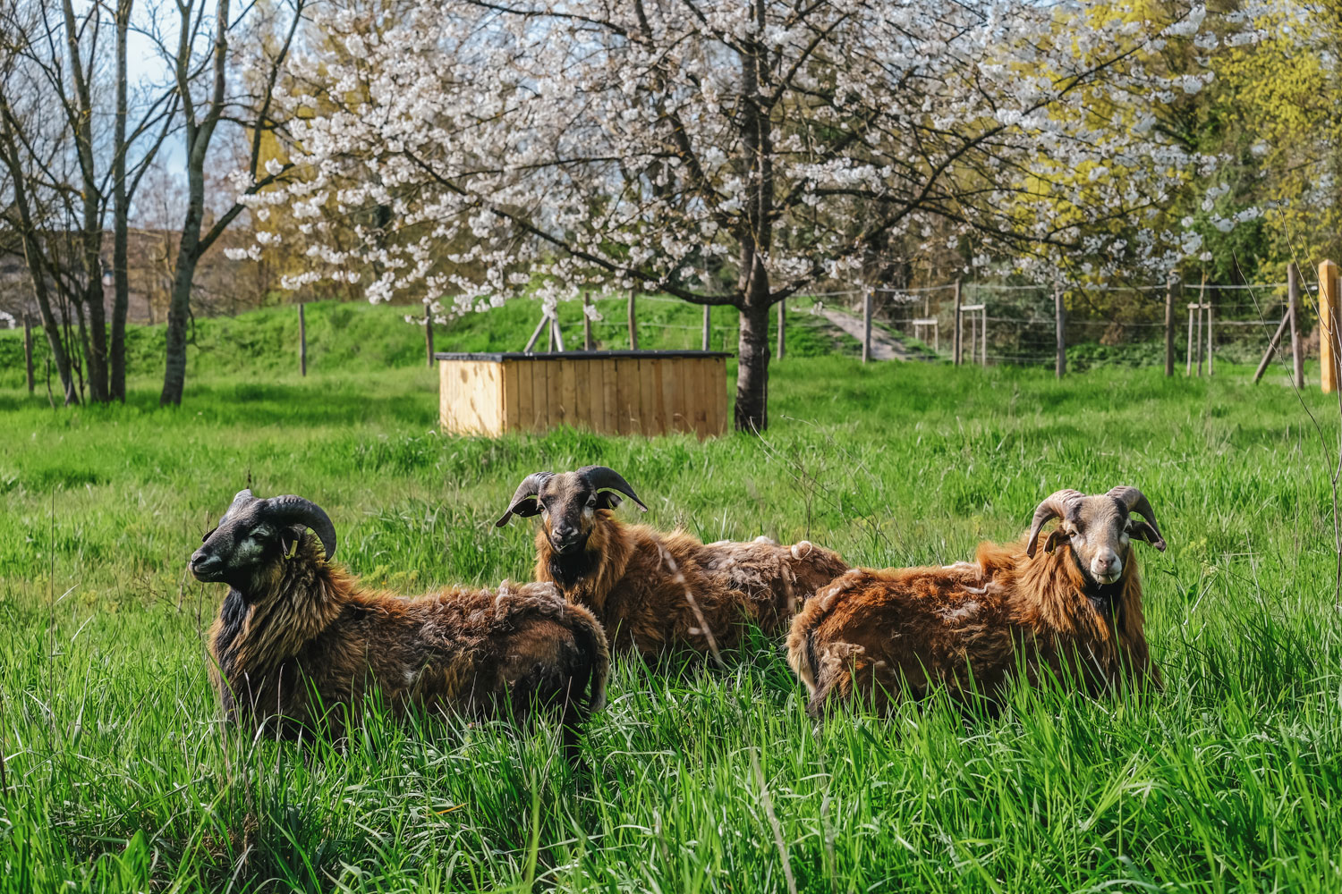 En remontant le pont vers la rue Providence, un enclos d’éco-pâturage, situé à l’arrière de la zone des jeux d’eau, couvre une surface de 2500 m² délimitée par 200 m linéaires de clôture. L’objectif est d’accueillir des animaux sur le parc pour le plaisir des enfants et de proposer une nouvelle méthode d’entretien de prairie urbaines en gestion extensive (fauche tardive). Cette action permet également de sensibiliser le grand public à la valorisation des animaux domestiqués. Ainsi depuis 2021, des moutons sont présents sur le parc une partie de l’année.